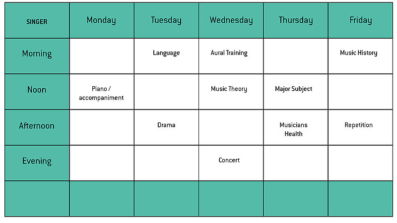 Your schedule will vary from week to week throughout the year. Some subjects are only available for limited periods during the year, while other subjects are available throughout the year. In addition to the scheduled classes, you should plan to set aside time for practicing and for unscheduled study activities such as masterclasses, workshops and concerts. When you do not have scheduled classes, you can reserve available rooms for practicing alone or with other students.