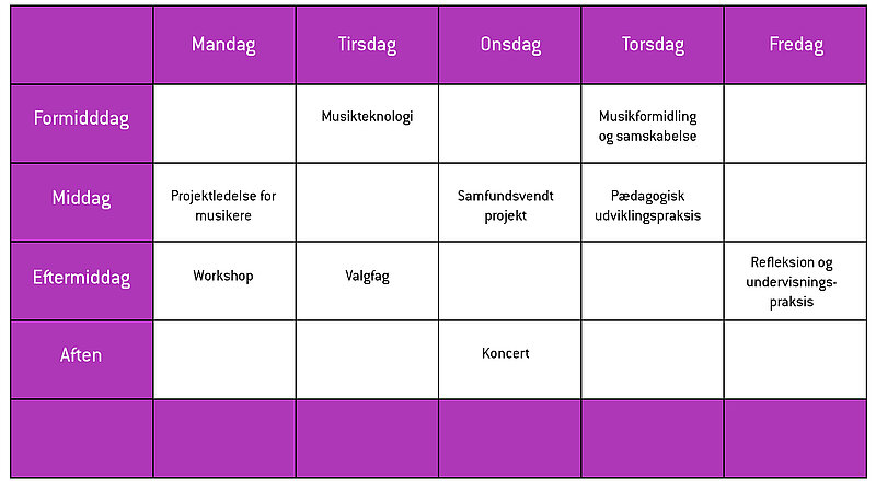 Dit skema vil variere fra uge til uge i løbet af året. Nogle fag har du kun i begrænsede perioder i løbet af året, mens der er andre fag du har hele året. Foruden de skemalagte fag skal regne med afsætte tid til øvning og til studieaktiviteter der ikke er skemalagte, som fx masterclasses, workshops og koncerter. Når du ikke har skemalagte kan du reservere ledige lokaler til øvning alene eller sammen med andre studerende.