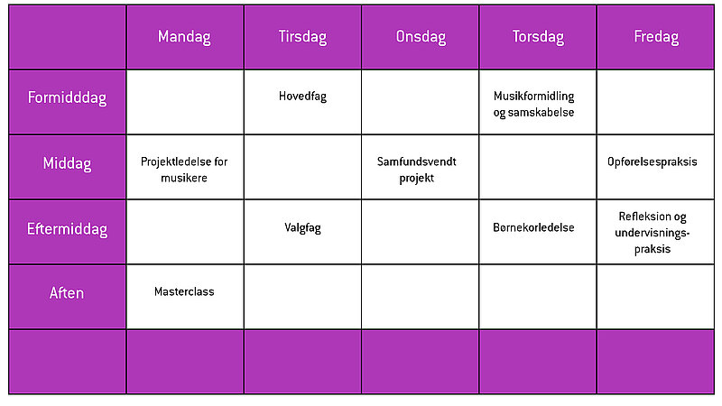 Dit skema vil variere fra uge til uge i løbet af året. Nogle fag har du kun i begrænsede perioder i løbet af året, mens der er andre fag du har hele året. Foruden de skemalagte fag skal regne med afsætte tid til øvning og til studieaktiviteter der ikke er skemalagte, som fx masterclasses, workshops og koncerter. Når du ikke har skemalagte kan du reservere ledige lokaler til øvning alene eller sammen med andre studerende.